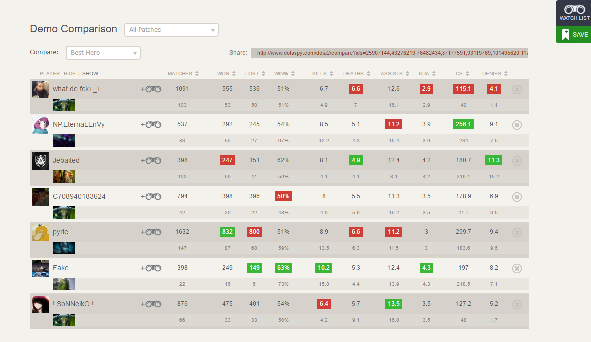 DotaSpy je trenutno u beta fazi i omogućava vam brzu pretragu igrača po njihovom imenu ili SteamID. Njegova primarna funkcija je – pronađi igrača i uporedi ga sa nekim drugim ili sa vama. Vrlo korisno kada želite da saznate ko je bolji Meepo – vi ili vaš prijatelj, bivši Starcraft igrač. Ovaj sajt omogućava i brzu pretragu pro igrača, koje isto tako možete upoređivati. Pretrage i uporedni pregledi se mogu snimiti i brzo pozvati za kasnije referenciranje.