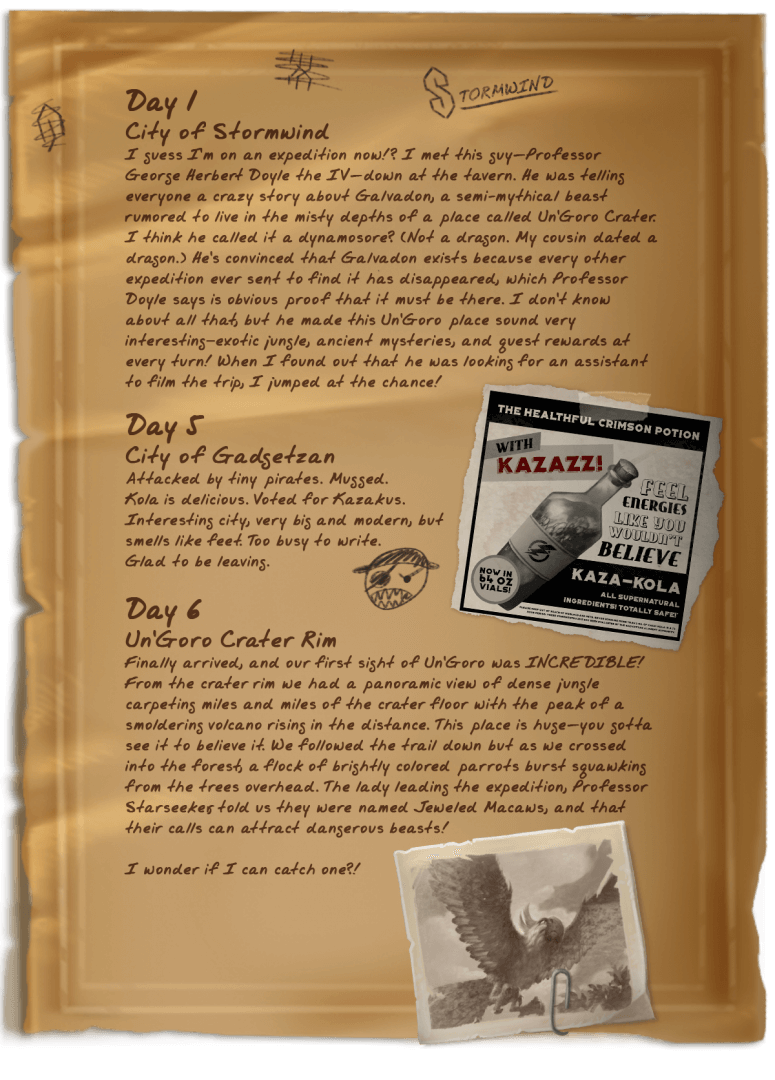 Osim ovog podkasta, neke nove zanimljive detalje smo otkrili i iz Blizzardovog bloga pod imenom “E. Malone’s Expedition Journal – week one”, koji govori o ekspediciji ka krateru Un’Goro. Tekst je veoma zanimljiv kao neka vrsta mini produbljavanja same priče oko ekspanzije, a posebno su zabavne Blizzardove reference na Pirate i Kazakusa u Gadgetzanu.