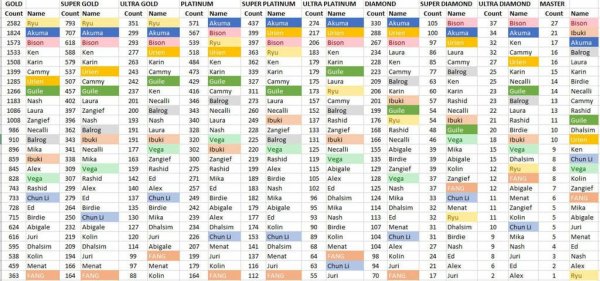 Korisnik Reddita _FIREPOWER_ je napravio tabelu sa svim igračima od Gold pa do Master rangova i vrlo je zanimljivo posmatrati rast i opadanje u broju likova po rangu. Tako, recimo, Ryu koji ima najmanje Master igrača ima najviše predstavnika u Gold rangu. Može se videti da je zastupljenost Ryu igrača obrnuto proporcionalana kako rangovi odmiču. Nash je u sličnoj situaciji, s tim što njegov pad nije toliko drastičan kao kod Ryua. Sa druge strane, Balrog je sve češća pretnja sa višim rangovima, dok u samom goldu nije toliko čest.