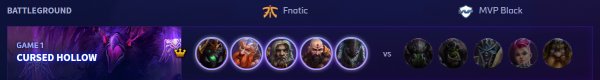 Triple warrior, specialist i support heroj, bez assassina. Čak ni se ni među ovim warrior herojima ne nalazi npr. Sonya koja ume da napravi damage kao assassin. Šta je MVP Black pokušao sa ovim draftom nikom nije jasno, naročito ne na velikoj mapi kao što je Cursed Hollow. Fnatic nije dopustio MVP Blacku da uopšte napravi neku svoju igru sa ovim draftom. Odlično su koristili global heroje i odigrali ovu mapu kako treba. Pogledajte sjajan potez na kraju partije kada nisu dozvolili protivniku sa svoja dva global heroja da se hearthstonuju nazad i tako dobili potrebno vreme da završe već oslabljeni core.