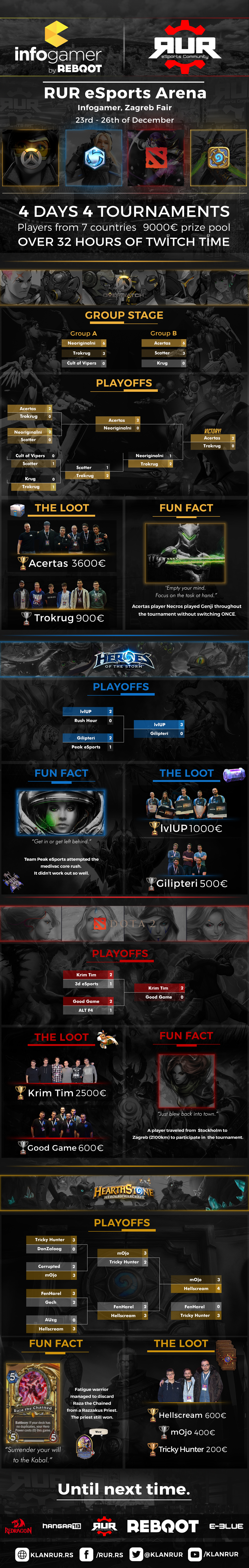 VESTI RUR – Reboot Infogamer infographic Kako je bilo na Reboot Infogameru možete videti ovde! Ako ste zainteresovani da pogledate vodove – mozete to uraditi na ovim linkovima: Heroes of the Storm Hearthstone DOTA 2 Overwatch ghosty Share This Previous ArticlePrva devojka u Overwatch ligi - Geguri se pridružila Shanghai Dragonsima Next ArticleWoT - Medalja: Heroji Raseiniai 14/02/2018