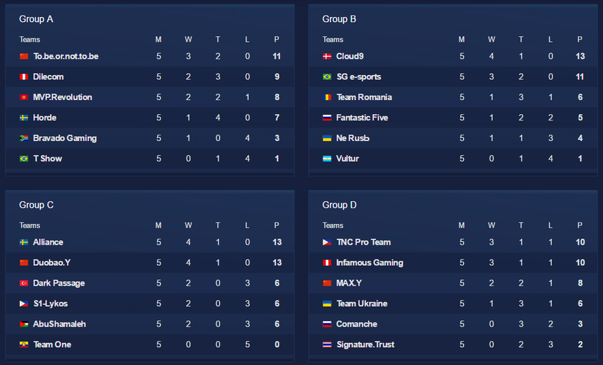 U grupi A prvo mesto je zauzeo kineski To.be.or.not.to.be, a prate ga Team DileCom i kurgistanska postava MVP Revolution. U grupi B Cloud9 je osigurao prvo mesto u grupi, a za plej-of su se kvalifikovali i SG e-sport i Team Romania. U grupi C Alliance, DUOBAO Young i turski tim Dark Passage su obezbedili prolaz dalje. U grupi D filipinski tim TNC PRo Team je zauzeo prvo mesto a peruanski Infamous drugo mesto. Iz grupe D u plej-of takođe prolazi i kineski MAX.Y.