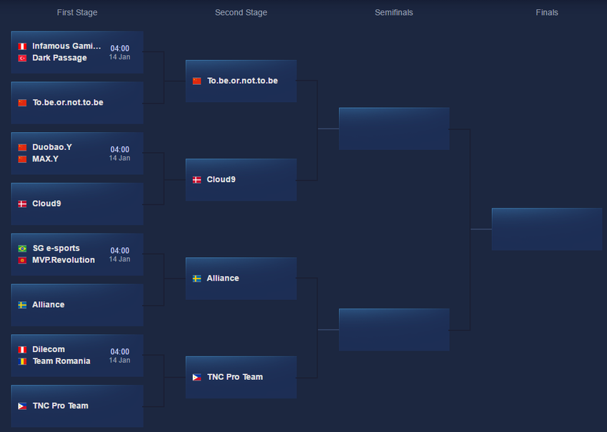 Prvoplasirani u grupama, To.be.or.not.to.be, Cloud9, Alliance i TNC Pro Team plej-of startuju od druge stanice – četvrtfinala, dok će ostali timovi početi od polufinala.