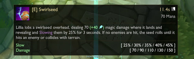 Lillia ispaljuje svoj Swirlseed koji se kotrlja do sudara sa terenom ili protivničkim herojem. Po kontaktu radi magični damage i slow.