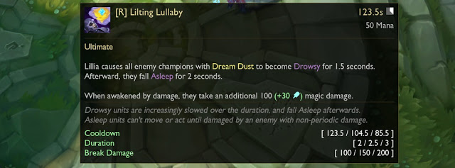 Lillia najpre usporava, a zatim i uspavljuje sve protivnike pod efektom Dream Dust-a na 2 sekunde. Ako ih probudi bilo kakva šteta, primaju dodatni magični damage.
