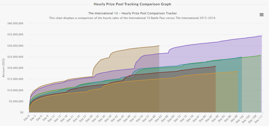 Vrednost ovogodišnjeg International-a je još od samog početka Battle Pass-a rastao ogromnom brzinom. Nagradni fond je za samo jedan dan prešišao $5 miliona, i od tada nije stao. Sledeće prelomne tačke su bile 15. juna sa $15 miliona, 26. juna sa $20 miliona, i 3. jula sa $20 miliona. Danas možemo da se pohvalimo sa $30,000,000.