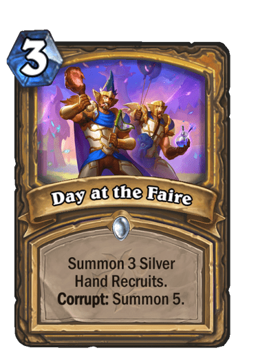 Pa da krenemo od Paladin Spell karte – Day at the Fair. To je Common magična karta koja košta 3 mane i stvara 3 Silver Hand Recruit-a, ali ako ste pre nego odigrali kartu koja košta više mane, tačnije aktivirali Corrput efekat, ona stvara 5 Silver Hand Recruit-ova. Ukoliko odigrate ovo na trećem potezu, neće biti najjača karta, ali u nekim drugim situacijama će moći mnogo da znači. Ipak, za razliku od druge dve Corrupt karte koje ćemo pomenuti danas, ovo je jedna koja može dobro da prođe čak iako je odigrate na samom početku, bez dodatnog efekta.