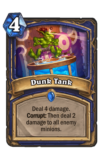 Za sam kraj sam ostavio Shaman spell kartu – Dunk Tank. Ovo je Rare magična karta, koja za četiri mane radi samo četiri dmg-a. Zvuči užasno, što i jeste ako je ne odigrate bez Corrupt efekta, ali sa njim postaje mnogo bolja, jer radi i 2 dmg-a svim protivničkim kartama. Kao što već rekoh, od ove tri, samo je Paladin karta igriva bez efekta, ali sa efektom ovo postaje bolji Swipe. Siguran sam da će biti karte koje će praviti kombinacije sa ovim efektom, pa verujem da će Shaman sa zadovoljstvom želeti da ubaci i ovu kartu u svoj špil.
