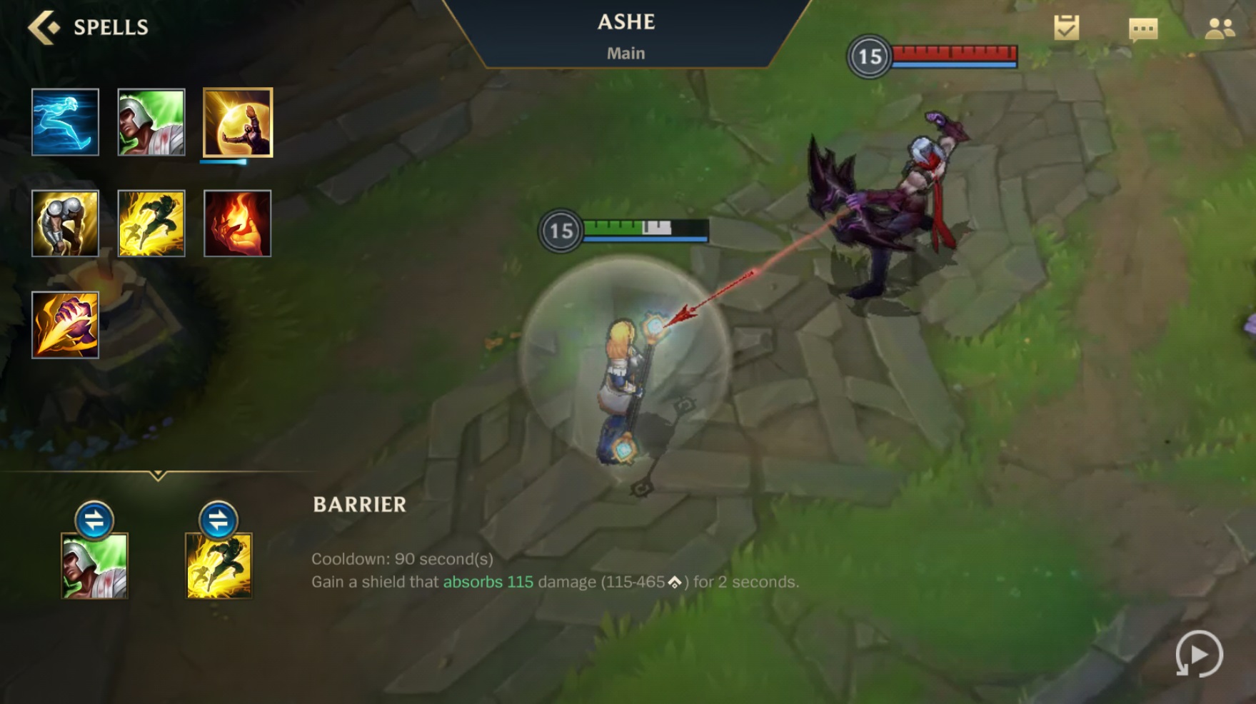 Još jedna defanzivna magija koja daje korisniku štit koji blokira sve što dolazi ka vama. Ignajt ne može da smanji efikasnost barijere tako da se često koristi za kontru šampionima koji ga koriste. Ova magija je idealna za šampione koji žele da nanesu što više demidža ali su ranjivi u borbama. Mejdžovi i marksmeni spadaju u ovu grupu. Marksmeni će uglavnom izabrati berijeru pre hila dok će njihovi saportovi uzeti hil da im pomognu u lejnu i partiji.