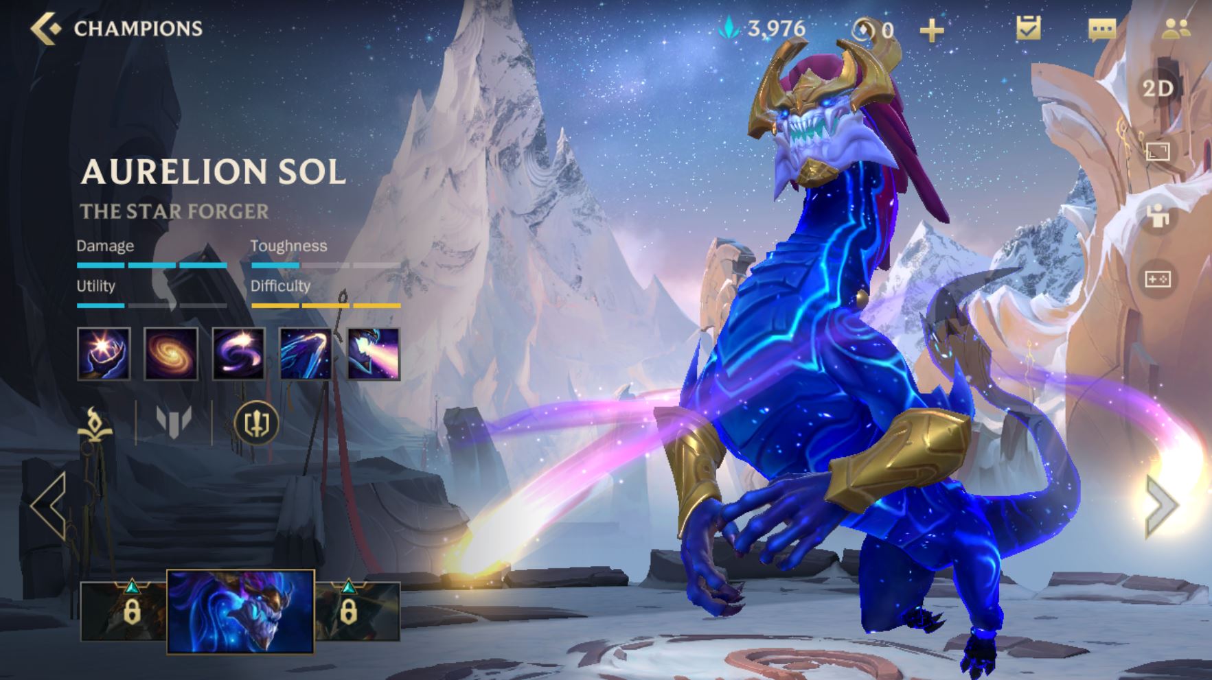 Iako je Aurelion Sol svrstan u redove težih šampiona za igranje, njegove magije na papiru ne izgledaju ništa specijalno, ali kada ih upotrebite zajedno mogu da nanesu veliki demidž. Kada igrate ovog šampiona jako je bitno da se krećete. Pozicioniranje biće ključ uspeha u lejnu i u timskim tučama u kasnim fazama meča. Njegova prva magija Starsurge može da napravi ogromne projektile koji mogu da stanuju protivnike i pokvare im planove pred početak tuče. Ako pogodite prvu magiju možete nadovezati Voice of Light ultimejt da nanesete demidži i usporite protivnika koji teško da će pobeći od vašeg Celestial Expansion-a. Treća sposobnost je korisna za bežanje ali pomoću nje možete da napravite i Starsurge od koji može da prekrije skoro čitav ekran.