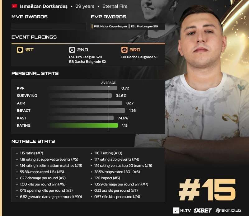 Ismailčan „XANTARES“ Dortkardeš, zvezda Eternal Fire-a, našao se na 15. mestu prestižne liste najboljih igrača Counter-Strike 2 scene za 2024. godinu, koju objavljuje HLTV.org.