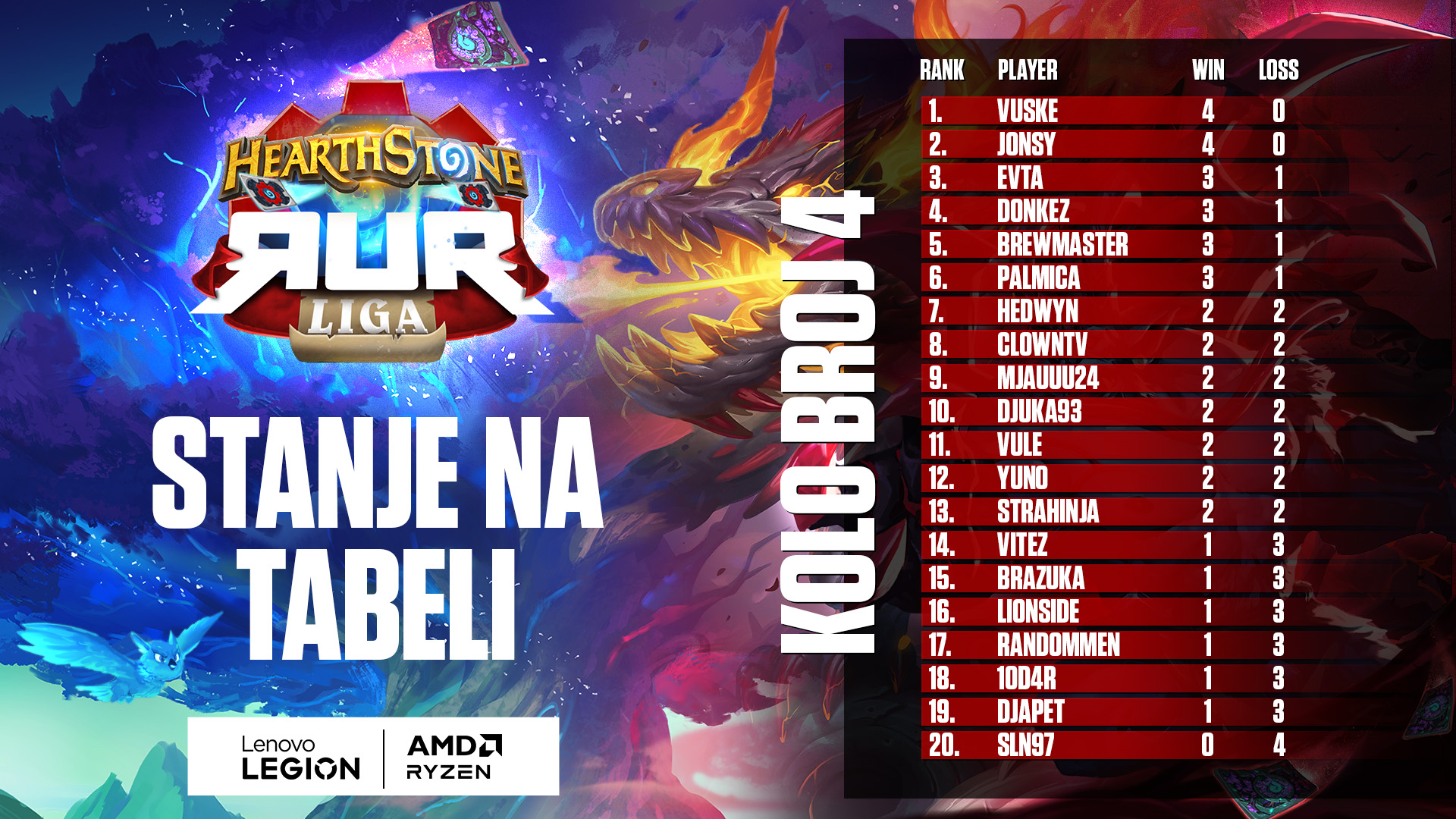Tokom vikenda za nama odigralo se četvrto kolo RUR Letnje Hearthstone Lige u kojoj se takmiči 20 najboljih igrača sa Balkana. Format turnira je takav da su svi igrači postavljeni u jednu veliku grupu, koja sadrži 5 Swiss format rundi, a najboljih 8 igrača nakon 5 odigranih kola plasiraće se u četvrtfinale!