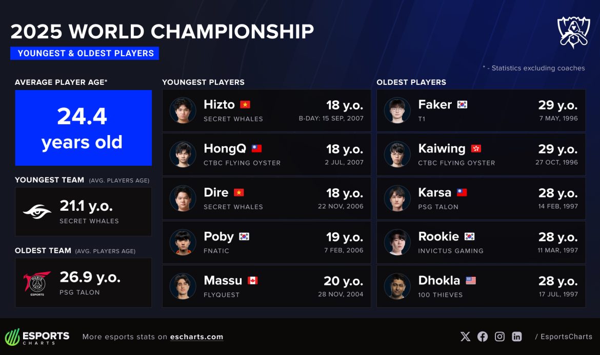 Najmlađi igrač turnira je Lê Văn “Hizto” Hoàng Hải iz Vijetnama, koji je napunio 18 godina u septembru, dok je najstariji ponovo Faker (29), koji i dalje dominira svetskom scenom bez naznaka povlačenja.