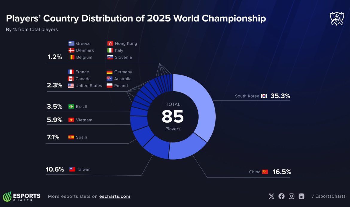 Kao i prethodnih godina, Južna Koreja ostaje najdominantnija zemlja u LoL esportu. Na Worldsu 2025, koji se održava u Kini, čak 9 od 17 timova ima bar jednog korejskog igrača, što čini ukupno 30 takmičara iz LCK regiona.